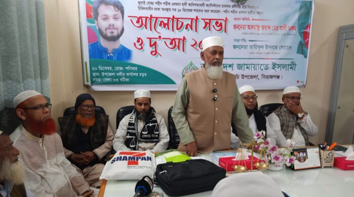 ভারতীয় আধিপত্যবাদীদের গুলিতে শহীদ ইনকিলাব মঞ্চের মুখপাত্র শরিফ ওসমান বিন হাদীর স্মরণে সিরাজগঞ্জের বেলকুচিতে আলোচনা সভা ও দোয়া মাহফিল অনুষ্ঠিত হয়েছে। শনিবার (২০ ডিসেম্বর) সন্ধ্যার দিকে বেলকুচি পৌর এলাকার শেরনগরস্থ দলীয় কার্যালয়ে আলোচনা সভায় সভাপতিত্ব করেন বেলকুচি উপজেলা জামায়াতের আমির আরিফুল ইসলাম সোহেল। প্রধান অতিথির বক্তব্য রাখেন কেন্দ্রীয় মজলিশে শুরা আরও পড়ুন