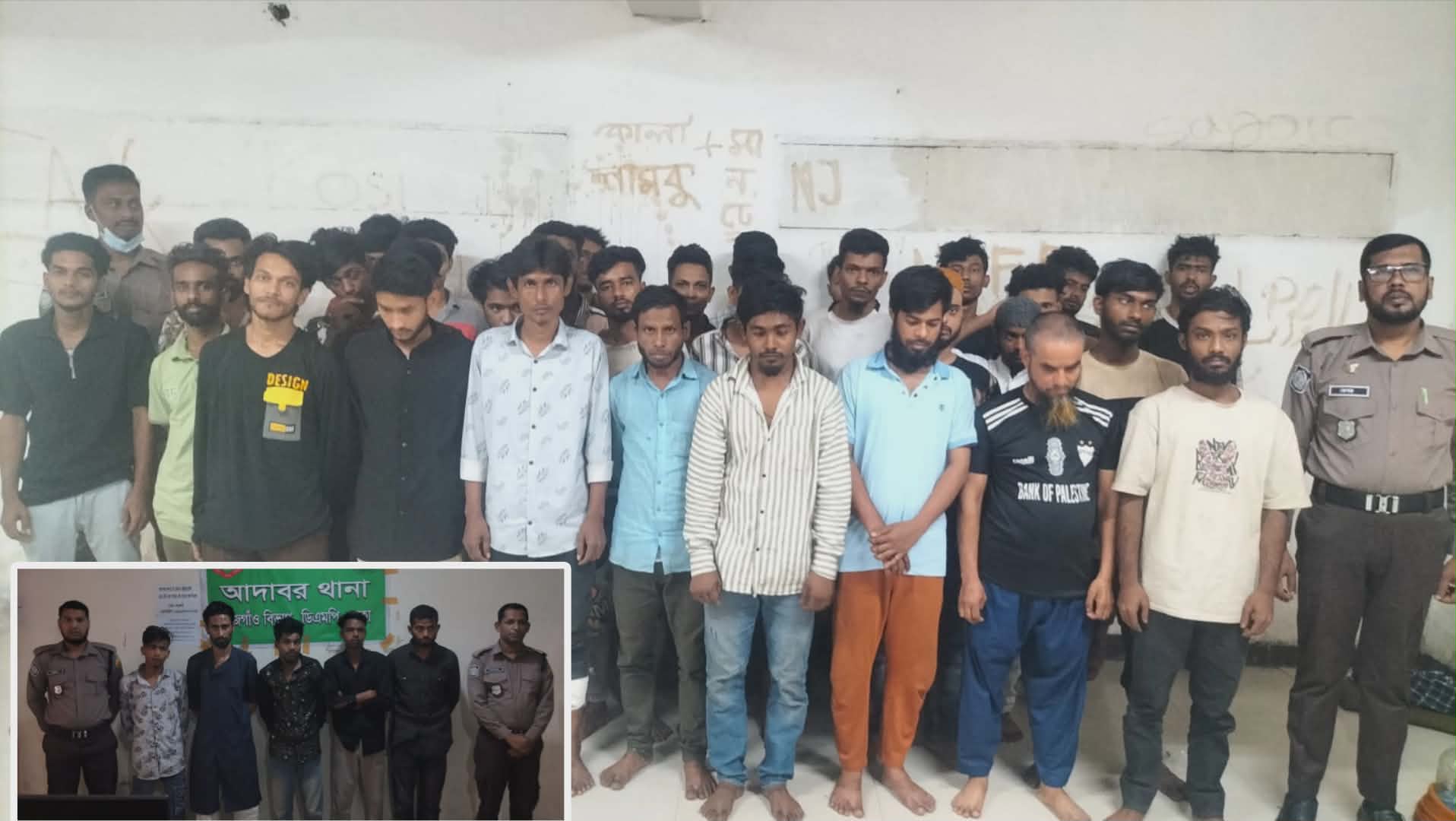 ফাইয়াজ (২১), রাসেল (২০), সাগর (২৪), বিজয় (৩০), রায়হান (২১), সোবাহান (২৭), সেন্টু (২৪), শাহেদ (২৪), খলিল (৩০),ইলিয়াস (৩০), সামীর (২৬), শোয়েব (২৭), জাহিদ (১৯), বিপ্লব (২৪), হাসান (২৩), বোরহান (২১), মামুন (১৯), সুমন (২৫) ও আলী আকবর হৃদয় (১৯)। এদের মধ্যে মাদক এবং পরোয়ানা -৭ জন (পরোয়ানা তামিল ৫ টি ), অন্যান্য সহ চাঁদাবাজি ২ জন, অন্যান্য ১ জন, অন্যান্য আইনে ২১ জন। গ্রেফতারকালে ২ কেজি ৩০০ গ্রাম গাঁজা, ১২০ পিস ইয়াবা ট্যাবলেট উদ্ধার করা হয়।