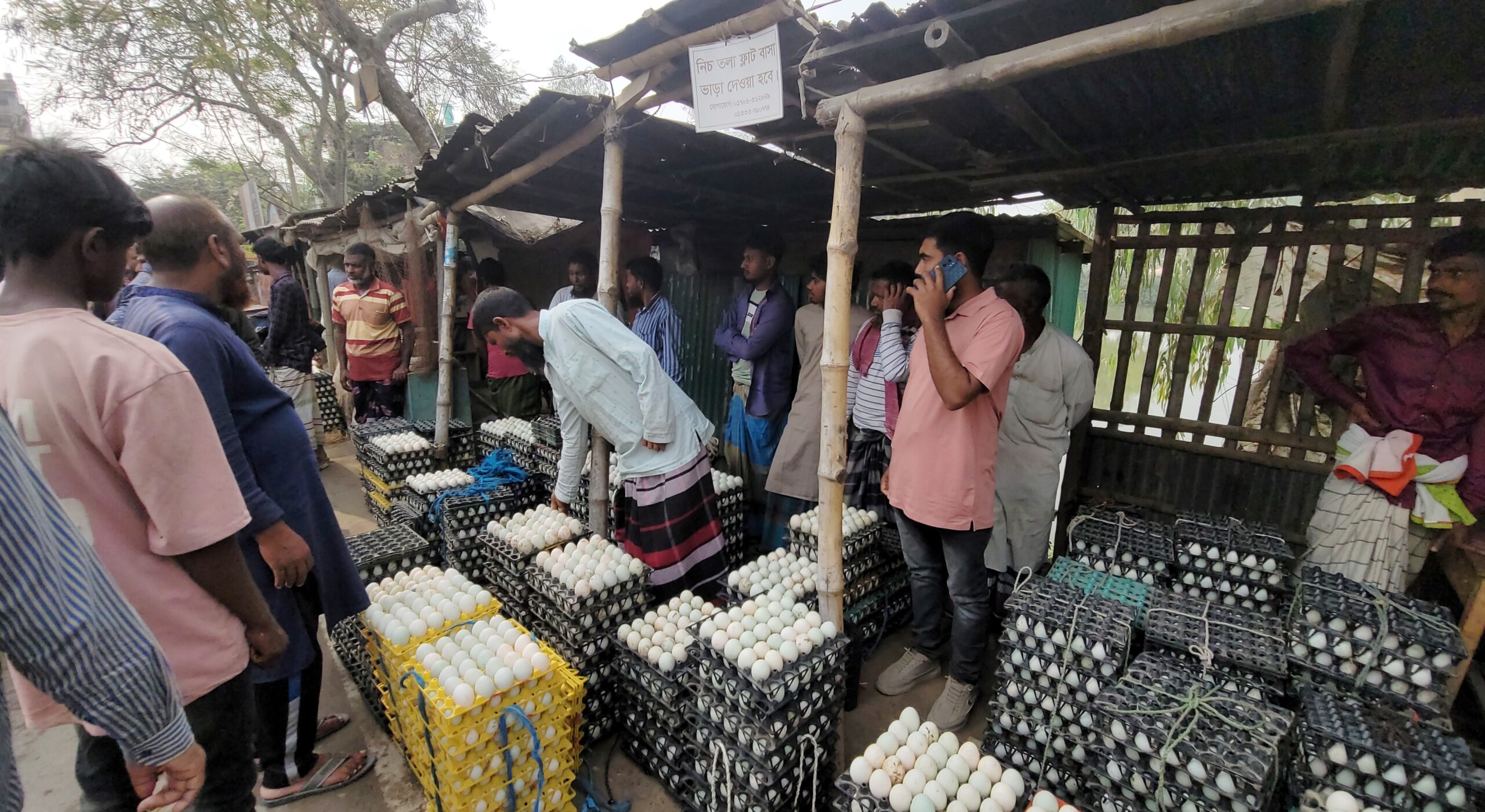 ডিমের পাইকার শহিদুল জানান,বেচাকেনা কম, আমদানি বেশি,গরম পরতেছে,মানুষ খাচ্ছে কম এই জন্য ডিমের দাম কম। তবে আশা করছি অল্প দিনের মধ্যে এ বাজার থাকবে না। আগের দামে ডিম বিক্রি হবে।