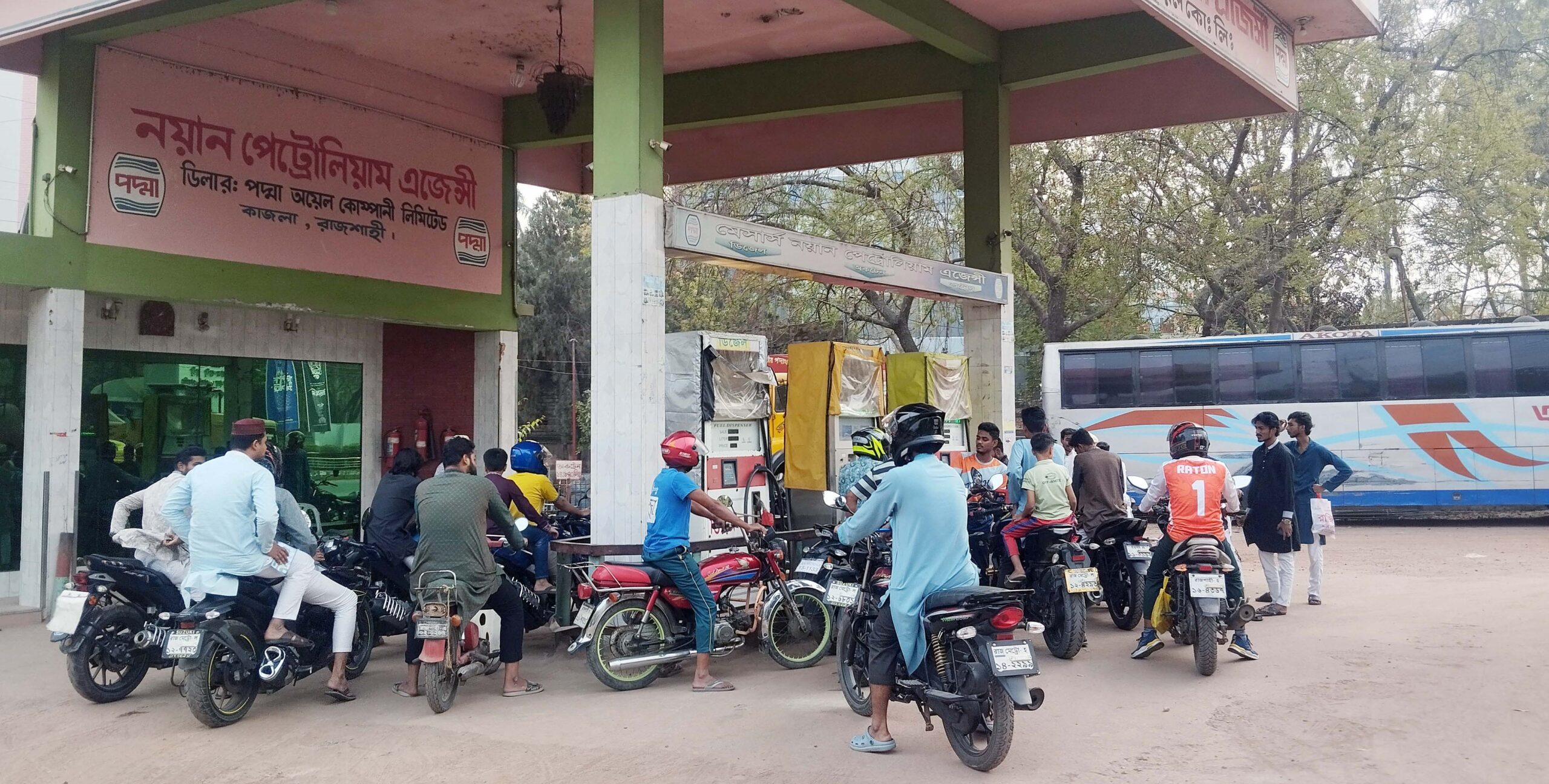 নগরীর মতিহার থানার অক্ট্রয় মোড় এলাকায় অবস্থিত নয়ন পেট্রোল পাম্পসহ একাধিক পাম্পে সকাল থেকেই দীর্ঘ লাইনে দাঁড়িয়ে তেল নিতে দেখা যায় মোটরসাইকেল, প্রাইভেটকার, ট্রাক, বাস ও অন্যান্য যানবাহনের চালকদের।