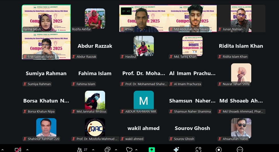 সিরাজগঞ্জের এনায়েতপুরে খাজা ইউনুস আলী বিশ্ববিদ্যালয়ে গ্লোবাল মিডিয়া এবং তথ্য সাক্ষরতা সপ্তাহ উদযাপন উপলক্ষে অনলাইন বারোয়ারী বিতর্ক প্রতিযোগিতা অনুষ্ঠিত হয়েছে।