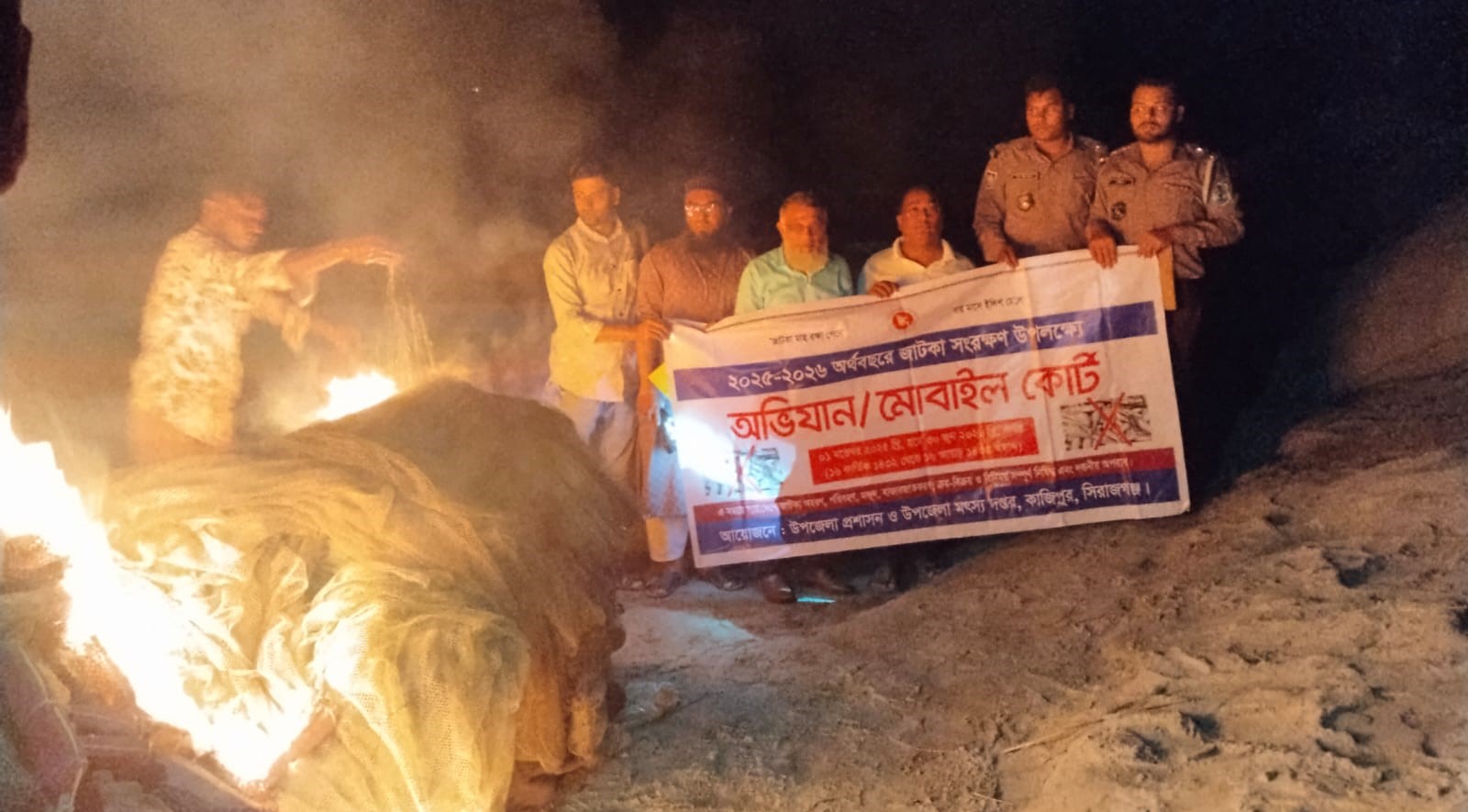 জব্দকৃত জালের আনুমানিক মূল্য ০২ প্রায় লক্ষ২৫ হাজার টাকা। এ সময়ে বগুড়া জেলার সারিয়াকান্দী উপজেলার কুতুবপুর এলাকার বনবাসী হালদারের পুত্র শ্রী শুকনাল( ৩২) ও তার ২ সহযোগীকে ৫ হাজার করে ১৫ হাজার টাকা অর্থদণ্ড প্রদান করা হয়। অপর একটি মামলায় সিরাজগঞ্জ জেলার কাজিপুর উপজেলার বরইতলী গ্রামের বাসী সাধুর পুত্র শ্রী মাধব (২৭) ও তার ২ সহযোগীকে ৫ হাজার করে ১৫ হাজার টাকা অর্থদণ্ড প্রদান করা হয়।