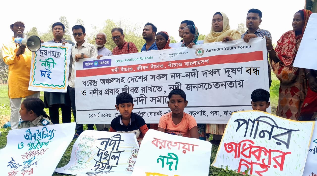 শনিবার (১৪ মার্চ) সকাল ১১টায় রাজশাহীর পবা উপজেলার বড়গাছি সূর্যপুর জেলেপাড়া সংলগ্ন বারনই নদীর তীরে রাজশাহী গ্রিন কোয়ালিশন, বরেন্দ্র ইয়ুথ ফোরাম এবং বেসরকারি উন্নয়ন গবেষণা প্রতিষ্ঠান বারসিক (ইঅজঈওক)-এর যৌথ উদ্যোগে এ সমাবেশ অনুষ্ঠিত হয়।