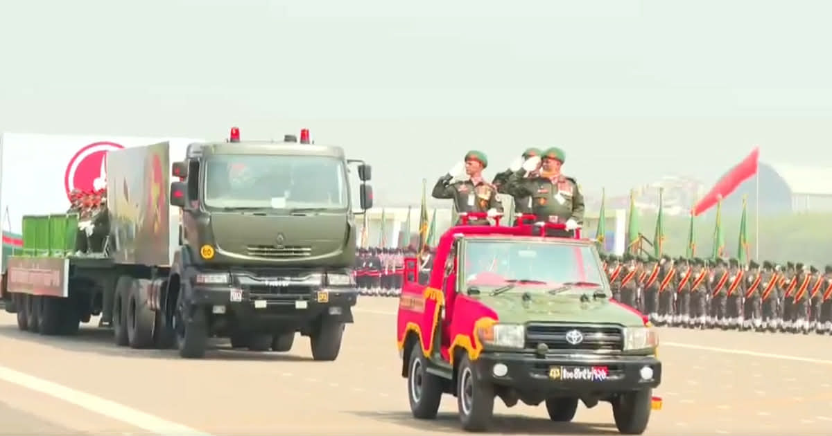 অনুষ্ঠানে প্রধান অতিথি হিসেবে রাষ্ট্রপতি মো. সাহাবুদ্দিন এবং বিশেষ অতিথি হিসেবে প্রধানমন্ত্রী তারেক রহমান উপস্থিত থেকে কুচকাওয়াজ পরিদর্শন ও সালাম গ্রহণ করছেন।