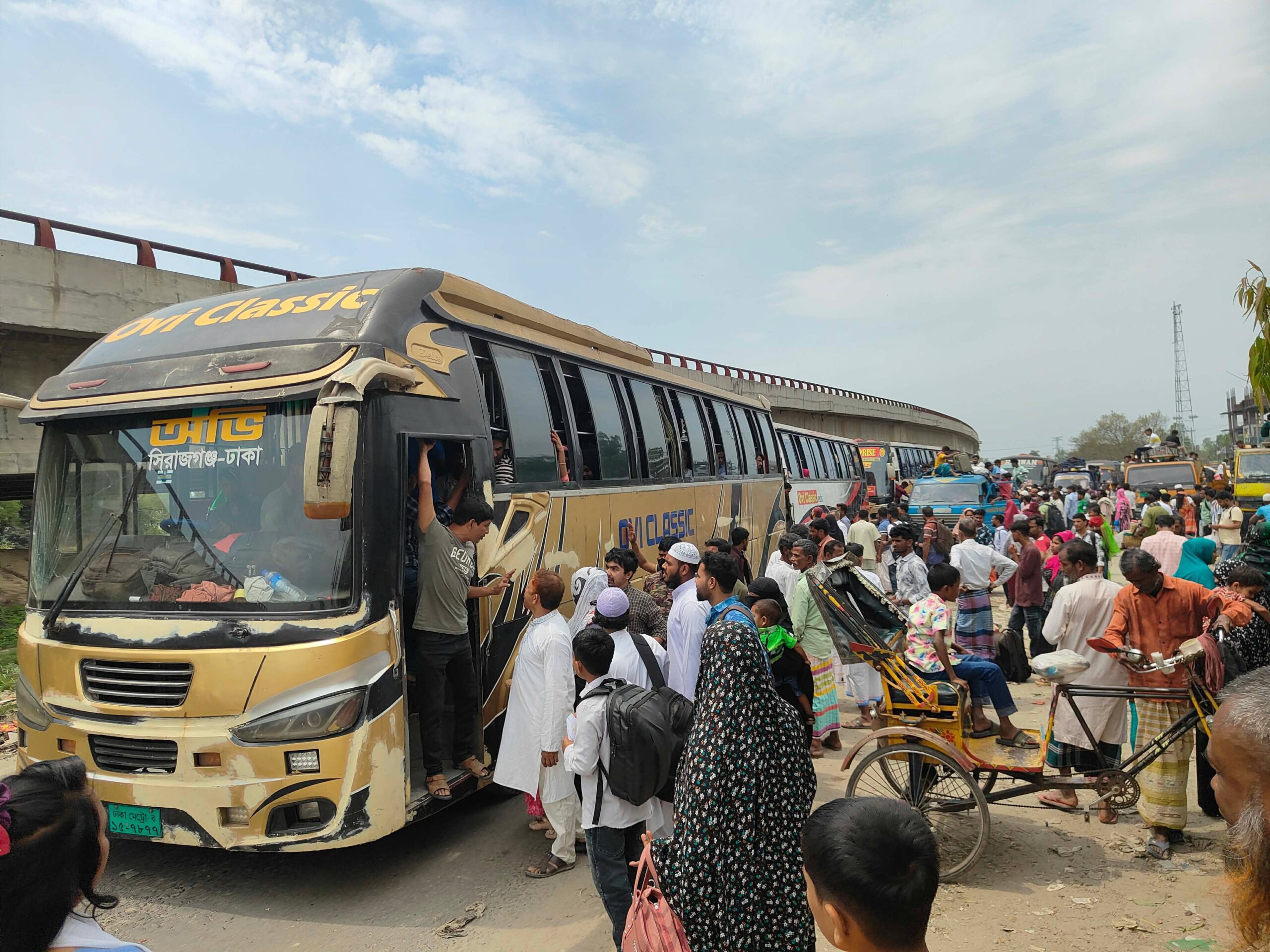 ঈদের ছুটি শেষে সিরাজগঞ্জসহ উত্তরাঞ্চল থেকে কর্মস্থলে ছুটছে মানুষ। যমুনা সেতুর পশ্চিম সংযোগ মহাসড়কের কড্ডা মোড়ে প্রচুর যাত্রীর চাপ লক্ষ করা গেছে। বাস, পিকআপ ও ট্রাকে করে যে যেভাবে পারছেন ঢাকার পথে ছুটছেন। তবে যাত্রীদের কাছ থেকে দ্বিগুণের বেশি বাড়া নেওয়া হচ্ছে বলে অভিযোগ উঠেছে। এদিকে, সকাল ১০টা পর্যন্ত সেতু এলাকায় যানবাহনের ধীরগতি থাকলেও বর্তমানে পরিস্থিতি স্বাভাবিক রয়েছে।