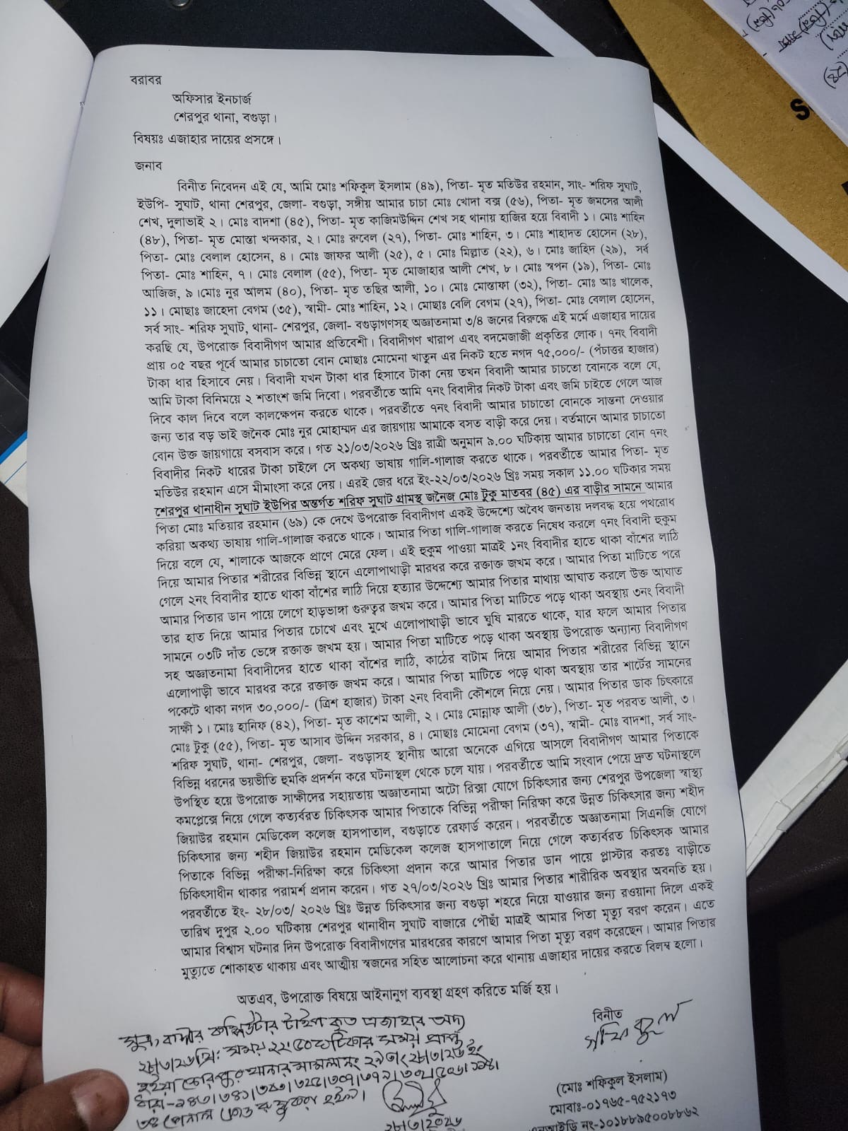 বগুড়ার শেরপুরে পাওনা টাকাকে কেন্দ্র করে প্রতিপক্ষের হামলায় গুরুতর আহত হয়ে চিকিৎসাধীন অবস্থায় মতিয়ার রহমান (৬৯) নামে একজনের মৃত্যু হয়েছে। এ ঘটনায় নিহতের ছেলে মো. শফিকুল ইসলাম বাদী হয়ে শেরপুর থানায় ১২ জন নামীয়সহ অজ্ঞাত আরও ৩-৪ জনের বিরুদ্ধে একটি হত্যা মামলা দায়ের করেছেন।