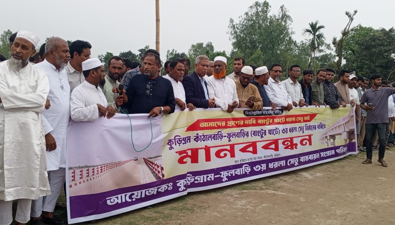 মানববন্ধনে অংশ নিয়ে স্থানীয় বাসিন্দা ও এনসিপি নেতা আশরাফুল আলম বলেন, ‘ দীর্ঘ দিন ধরে ফুলবাড়ী থেকে বাংটুর ঘাট পর্যন্ত তৃতীয় ধরলা সেতুর দাবি জানানো হচ্ছে। কিন্তু আজ পর্যন্ত কোন উদ্যোগ নেই। এই সেতুটির অভাবে চরম ভোগান্তি ও দূর্ভোগের শিকার হচ্ছেন কুড়িগ্রাম সদরের হলোখানা, কাঁঠালবাড়ী ইউনিয়ন সহ ফুলবাড়ী উপজেলার মানুষজন। এই নদী পথে পারাপারের সময় আমার দুই ভাই নদীর পানিতে ডুবে প্রাণ হারিয়েছিল। সেতু না থাকায় গর্ভবতী নারীসহ গুরুতর অসুস্থ মানুষদের জরুরি চিকিৎসা দিতে নানা বিড়ম্বনার শিকার হতে হয়। কৃষকরা কৃষিপণ্যের নায্য মুল্য পান না। নানা দুর্ভোগ নিয়ে শিক্ষার্থীরা শিক্ষা প্রতিষ্ঠানে যায়। ব্যবসায়ীরা পণ্য পরিবহনে আর্থিকভাবে ক্ষতিগ্রস্ত হচ্ছেন। অবিলম্বে ফুলবাড়ী থেকে বাংটুর ঘাট পর্যন্ত তৃতীয় ধরলা সেতুর নির্মাণের জোর দাবি জানাতে আমাদের এই মানবন্ধন। ’