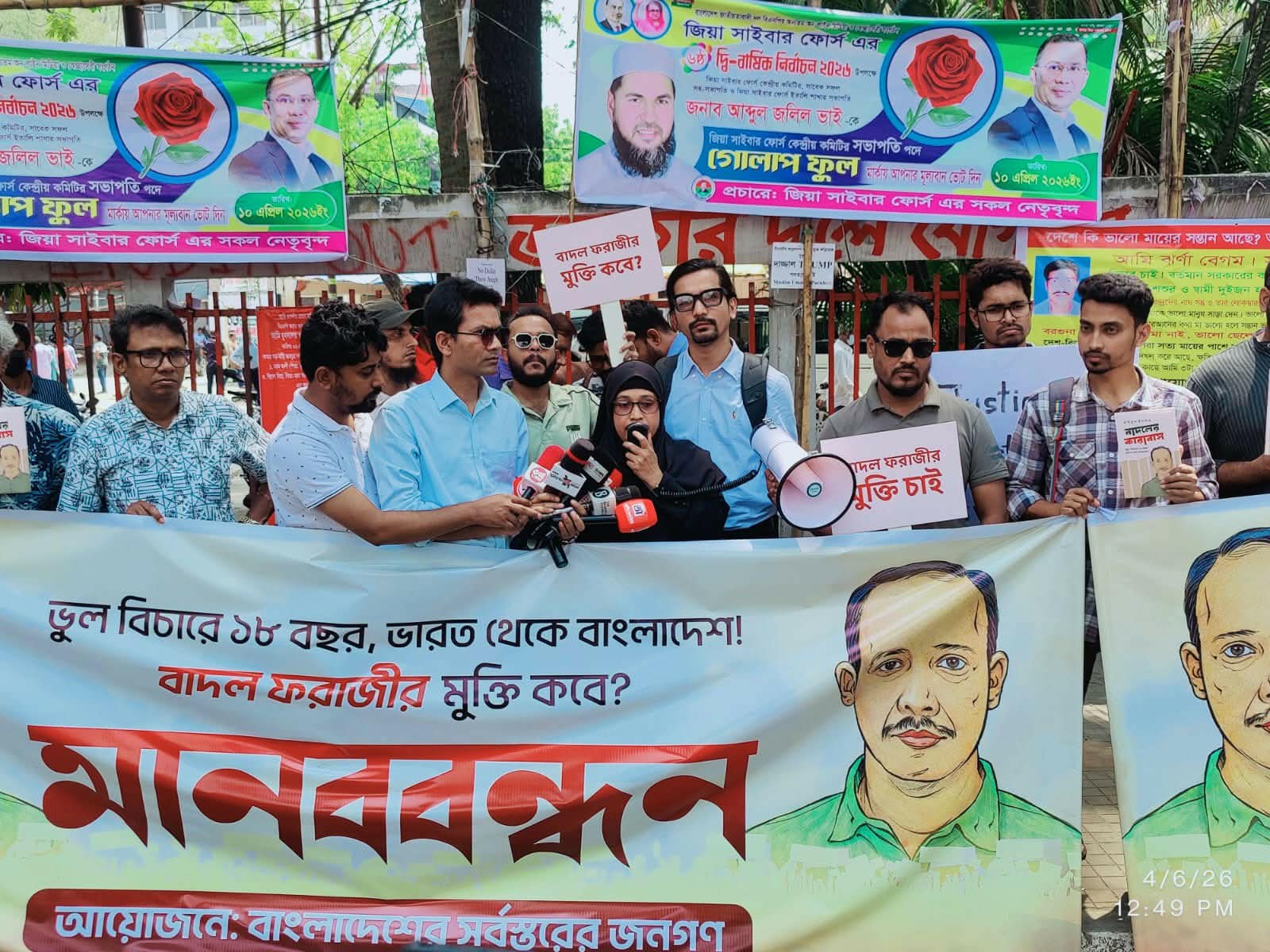 ভারতের কারাগারে এক দশক এবং বাংলাদেশের কারাগারে আরও আট বছর কাটানো নির্দোষ যুবক বাদল ফরাজীর মুক্তির দাবিতে রাজধানীর জাতীয় প্রেসক্লাবে সোমবার (৬ এপ্রিল) মানববন্ধন অনুষ্ঠিত হয়।