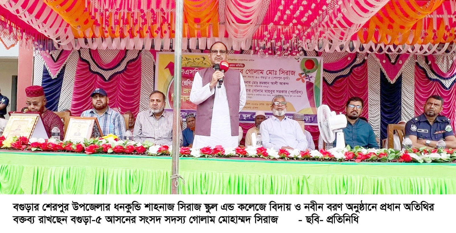অনুষ্ঠানে প্রধান অতিথি হিসেবে উপস্থিত ছিলেন বগুড়া-৫ আসনের সংসদ সদস্য গোলাম মোহাম্মদ সিরাজ। প্রধান অতিথির বক্তব্যে তিনি শিক্ষার্থীদের উদ্দেশ্যে অত্যন্ত আবেগঘন কণ্ঠে বলেন, বিদায় মানেই শেষ নয়, বরং এটি এক নতুন দিগন্তের শুরু। এই বিদায় তোমাদের উচ্চতর শিক্ষার সোপানে পা রাখার এক বিশেষ মুহূর্ত। তোমরা এখান থেকে যে শিক্ষা ও আদর্শ গ্রহণ করেছ, তা যেন সারা জীবন তোমাদের পথ দেখায়। দেশের যোগ্য নাগরিক হয়ে তোমরাই এদেশের মুখ উজ্জ্বল করবে। তিনি নতুনদের স্বাগত জানিয়ে শিক্ষার মানোন্নয়নে শিক্ষক-অভিভাবক ও শিক্ষার্থীদের সমন্বিত প্রচেষ্টার ওপর গুরুত্বারোপ করেন।