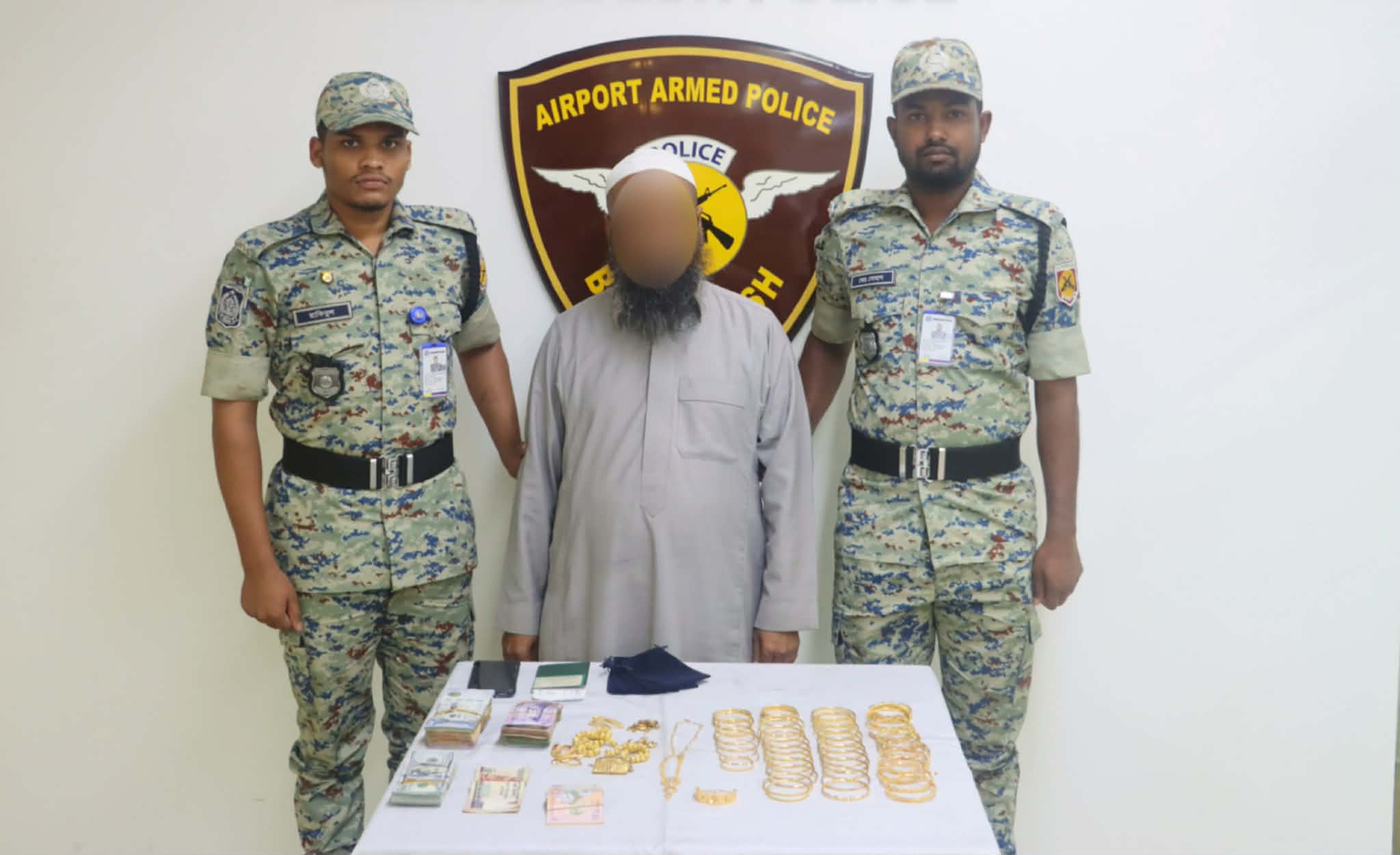 ঢাকার হযরত শাহজালাল আন্তর্জাতিক বিমানবন্দর থেকে প্রায় ৫০০ গ্রাম স্বর্ণালংকার ও বিপুল পরিমাণ বৈদেশিক মুদ্রাসহ মফিদুল ইসলাম (৪৩) নামের এক ব্যক্তিকে আটক করেছে এয়ারপোর্ট আর্মড পুলিশ ব্যাটালিয়ন (এপিবিএন)।