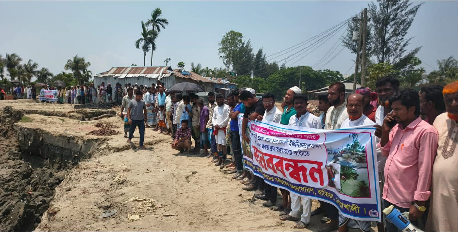 নোয়াখালীর হাতিয়া উপজেলার ২ নম্বর চানন্দী ইউনিয়নে নদীভাঙন রোধে বরাদ্দকৃত প্রকল্প দ্রুত বাস্তবায়নের দাবিতে মানববন্ধন করেছেন ভাঙনকবলিত এলাকার বাসিন্দারা।