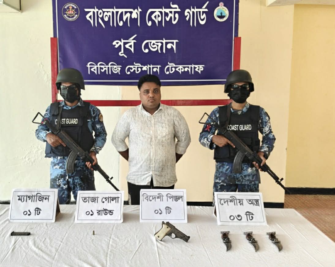 কক্সবাজারের টেকনাফে বিদেশি পিস্তল, তাজা গুলি ও দেশীয় অস্ত্রসহ এক কুখ্যাত সন্ত্রাসীকে আটক করেছে কোস্ট গার্ড।