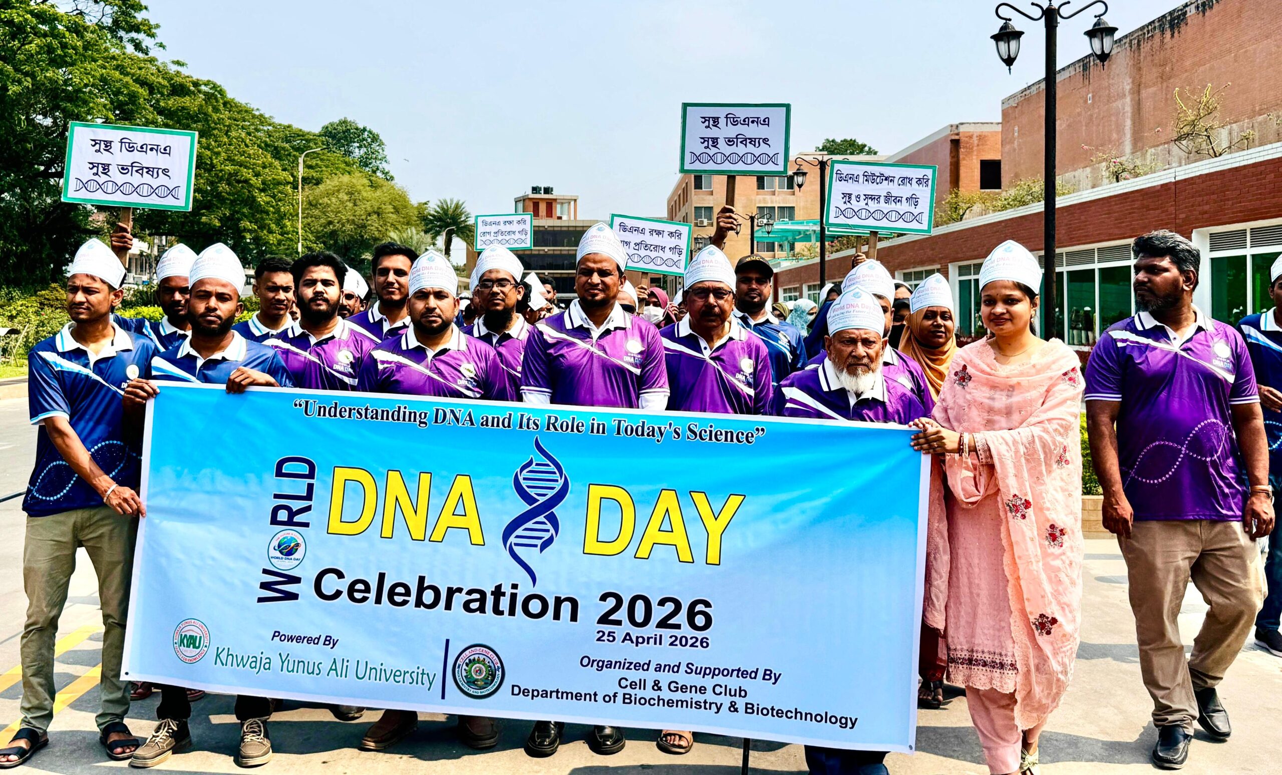 বিশ্ব ডিএনএ দিবস উপলক্ষ্যে সিরাজগঞ্জের এনায়েতপুরে অবস্থিত খাজা ইউনুস আলী বিশ্ববিদ্যালয়ে বর্ণাঢ্য র্যালি ও বিভিন্ন বিজ্ঞানভিত্তিক প্রতিযোগিতা অনুষ্ঠিত হয়েছে।