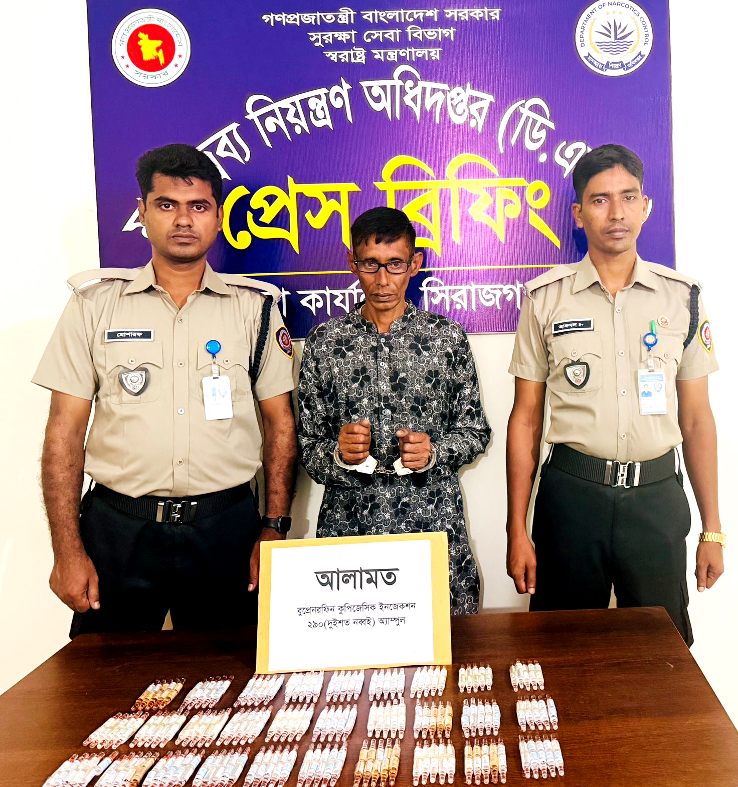 সিরাজগঞ্জে মাদকদ্রব্য নিয়ন্ত্রণ অধিদপ্তরের অভিযানে ২৯০ পিস বুপ্রেনরফিনযুক্ত কুপেনজেশিক ইঞ্জেকশনসহ একজনকে আটক করেছে।