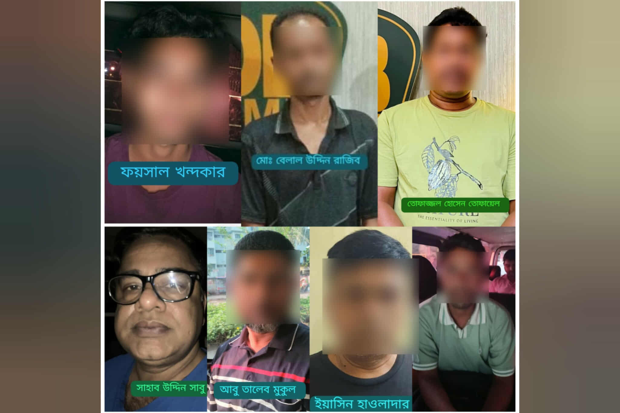 গ্রেফতাররা হলেন- বরগুনা জেলা যুবলীগের সাবেক সাধারণ সম্পাদক ও বর্তমান সিনিয়র সহ-সভাপতি সাহাবুদ্দিন সাবু (৫০), পল্টন থানা আওয়ামী লীগের সহ-সভাপতি ইয়াছিন হাওলাদার ওরফে ইয়াছিন কোম্পানি (৫৭), ঢাকা মহানগর দক্ষিণ রমনা থানা যুবলীগের সহ-সভাপতি বেলাল উদ্দিন রাজিব (৩৮), ছাত্রলীগের সক্রিয় সদস্য ফয়সাল খন্দকার (১৯), আওয়ামী লীগের সক্রিয় সদস্য ও একাধিক ঝটিকা মিছিলে অংশগ্রহণকারী শামীম শেখ (৩২), টাঙ্গাইল জেলার ধানবাড়ী উপজেলা আওয়ামী লীগের সাবেক ভাইস চেয়ারম্যান আবু তালেব মুকুল (৪৬) ও যুবলীগ কেন্দ্রীয় নির্বাহী কমিটির সহ-সম্পাদক তোফাজ্জল হোসেন তোফায়েল (৪৫)।