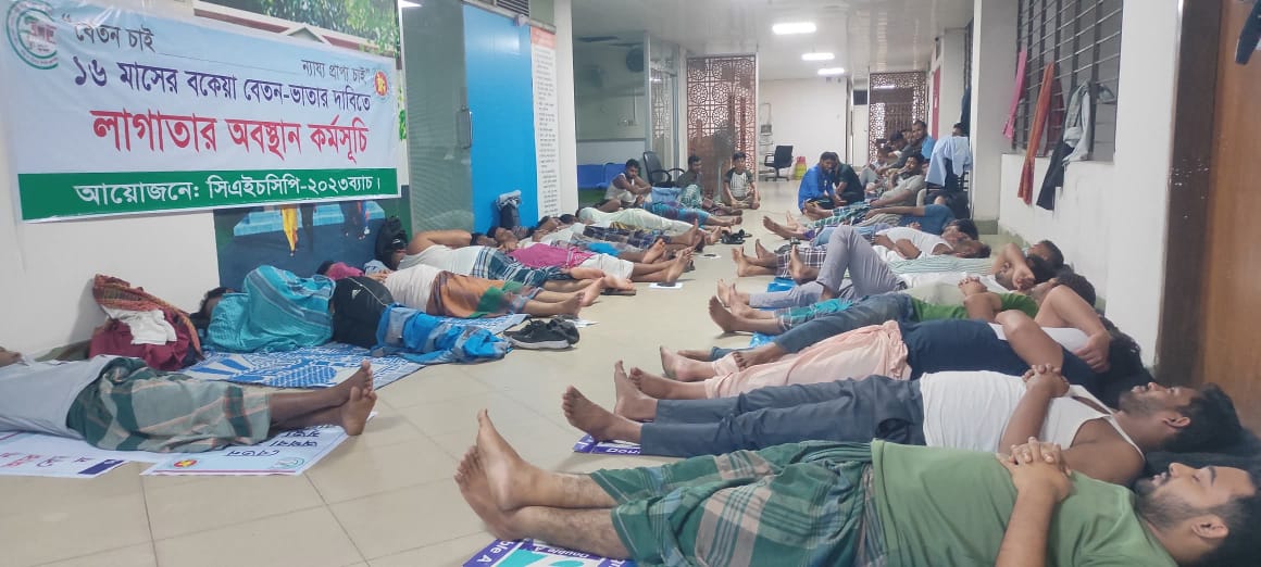 দীর্ঘ ১৬ মাস ধরে বেতন-ভাতা না পাওয়ার প্রতিবাদে কমিউনিটি ক্লিনিক স্বাস্থ্য সহায়তা ট্রাস্ট অফিস অবরুদ্ধ করে অবস্থান কর্মসূচি পালন করছেন কমিউনিটি ক্লিনিকে কর্মরত ৬৩৪ জন কমিউনিটি হেলথকেয়ার প্রোভাইডাররা (সিএইচসিপি)। তাদের এই অবস্থান কর্মসূচির ফলে নিজ কার্যালয়ে একরকম অবরুদ্ধ হয়ে পড়েছেন ট্রাস্টের ব্যবস্থাপনা পরিচালক (এমডি) মো. আখতারুজ্জামানসহ অন্যান্য কর্মকর্তা-কর্মচারীরা।
