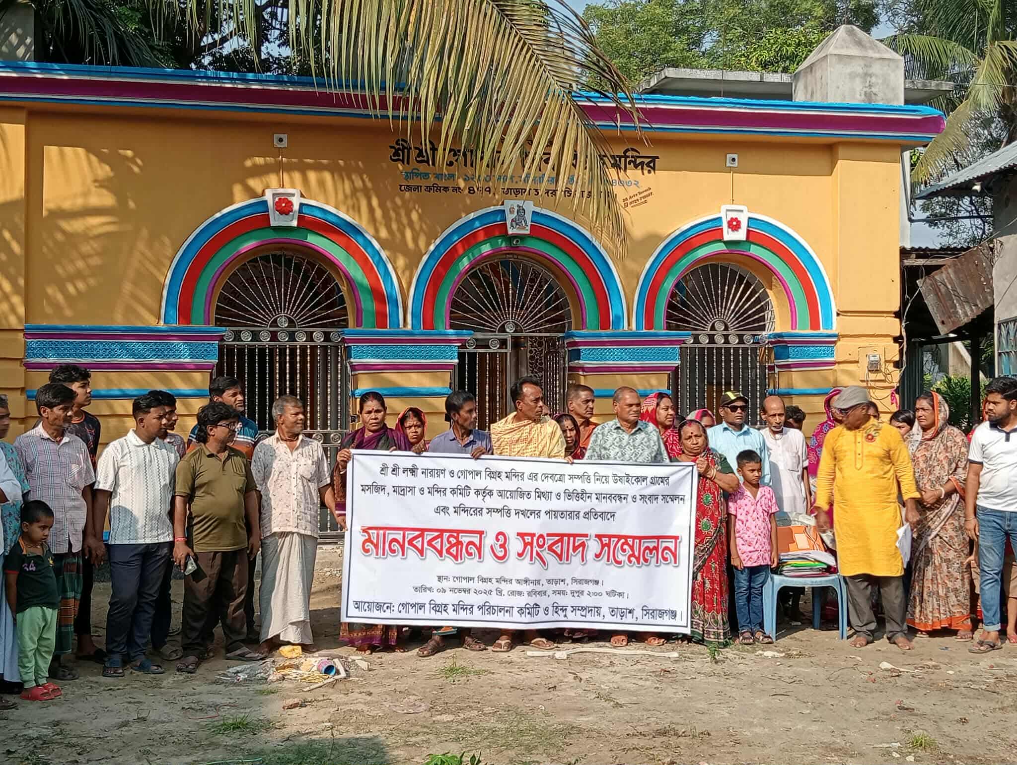 রবিবার দুপুরে গোপাল বিগ্রহ মন্দির কমিটির আয়োজনে স্থানীয় হিন্দু সম্প্রদায়ের নারী-পুরুষ মন্দির প্রাঙ্গণে ওই মানববন্ধন ও সংবাদ সম্মেলন কর্মসূচি পালন করেন।