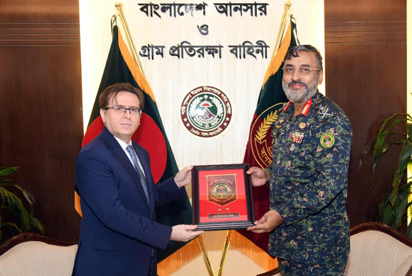 আজ বৃহস্পতিবার ( ১৩ নভেম্বর) বাংলাদেশ আনসার ও গ্রাম প্রতিরক্ষা বাহিনীর সদর দপ্তরে বাহিনীর মহাপরিচালক মেজর জেনারেল আবদুল মোতালেব সাজ্জাদ মাহমুদের সাথে বাংলাদেশে নিযুক্ত তুরস্কের রাষ্ট্রদূত রামিস সেন (Ramis Şen)