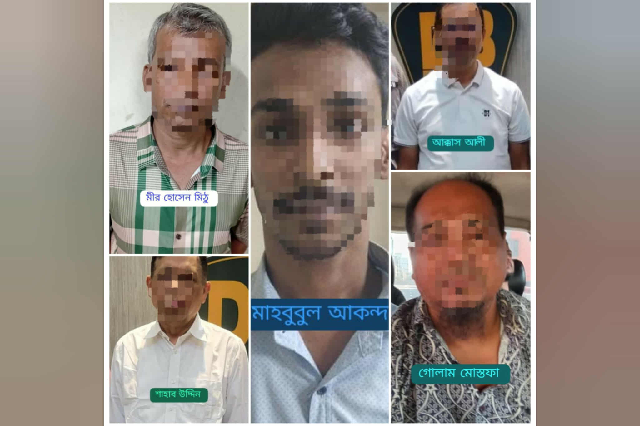 গ্রেফতাররা হলেন- ভেদরগঞ্জ উপজেলা আওয়ামী লীগের সদস্য গোলাম মোস্তফা (৫৬), মিরপুর থানাধীন ৭ নম্বর ওয়ার্ডস্থ এ ব্লক ইউনিট আওয়ামী লীগের সিনিয়র সহ-সভাপতি মো. নজরুল ইসলাম লিটন (৫৫), ছাত্রলীগের সক্রিয় কর্মী মো. মাহাবুল আকন্দ (২০), নোয়াখালী জেলা আওয়ামী লীগের আহ্বায়ক কমিটির সদস্য মো. শাহাব উদ্দীন (৬০) ও আওয়ামী লীগের সক্রিয় কর্মী মীর হোসেন মিঠু (৪৩)।