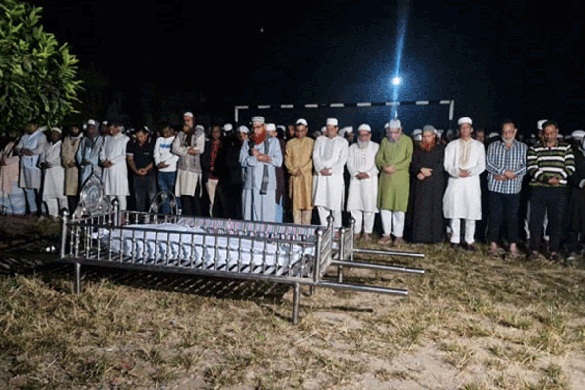 জানাজার আগে রাত ১১টায় নিহতদের লাশ ঢাকা মেডিকেল কলেজ হাসপাতাল থেকে মাদরাসা মাঠে আনা হলে স্বজন, সহকর্মী ও এলাকাবাসী ভিড় করেন। পুরো এলাকায় নেমে আসে শোক।