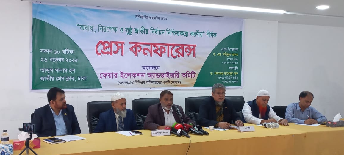 আসন্ন ত্রয়োদশ জাতীয় সংসদ নির্বাচন অবাধ, নিরপেক্ষ ও সুস্ঠু জাতীয় নির্বাচন আয়োজনে নির্বাচন কমিশন ও সংশ্লিষ্টদের সর্বোচ্চ পেশাদারিত্ব ও নৈতিকতা প্রদর্শনের আহ্বান জানিয়েছে ফেয়ার ইলেকশন অ্যাডভাইজরি কমিটি। আজ (২৬ নভেম্বর) সকাল ১০ টায় জাতীয় প্রেসক্লাবের আব্দুস সালাম হলে এক সাংবাদিক সম্মেলনে এই আহ্বান জানান তারা।