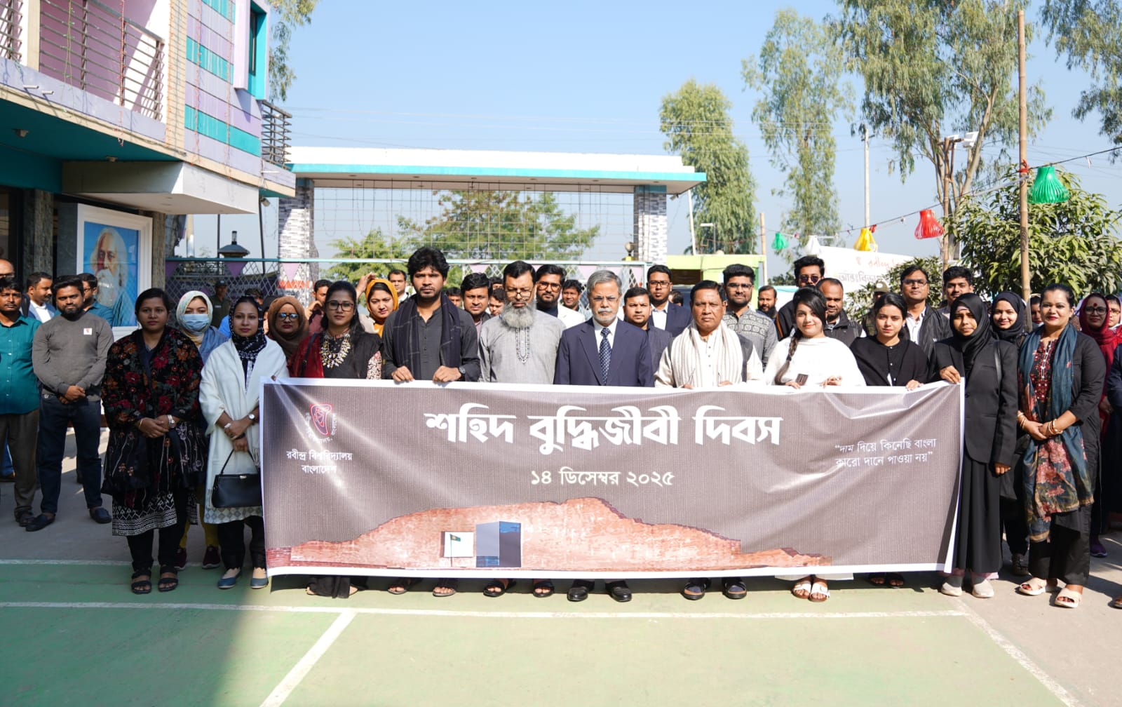 যথাযথ মর্যাদা ও ভাবগাম্ভীর্যের মধ্য দিয়ে রবীন্দ্র বিশ্ববিদ্যালয়ে শহিদ বুদ্ধিজীবী দিবস পালিত হয়েছে। দিবসটি উপলক্ষে রবিবার সকালে বিশ্ববিদ্যালয়ের অস্থায়ী অ্যাকাডেমিক ভবন-৩ এর শহিদ মিনারে পুষ্পস্তবক অর্পণ করা হয়।