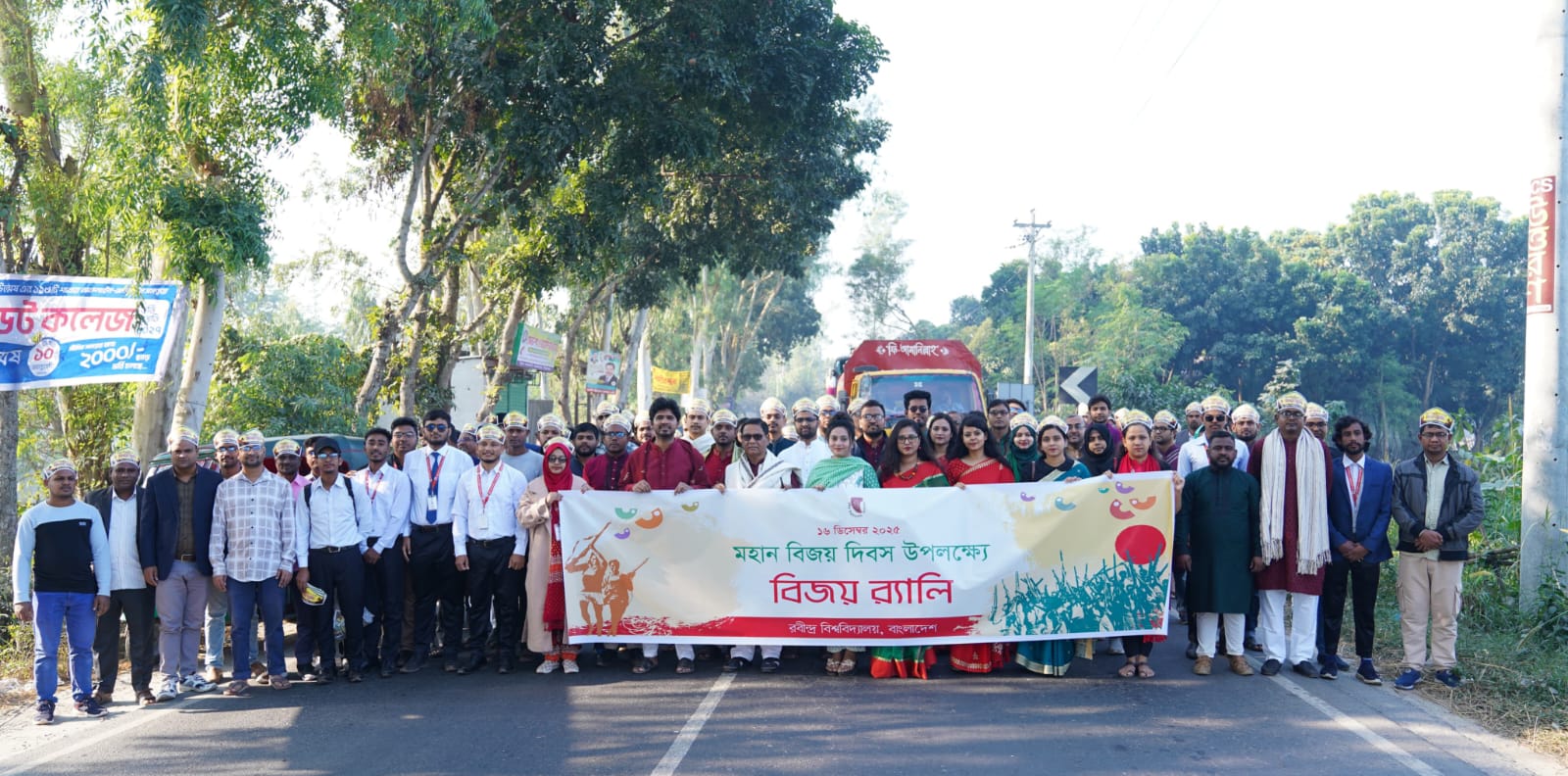 সকাল ৯টায় রবীন্দ্র বিশ্ববিদ্যালয়ের অস্থায়ী অ্যাকাডেমিক ভবন-২ থেকে একটি বিজয় র‌্যালি শুরু হয়। র‌্যালিটি বিভিন্ন সড়ক প্রদক্ষিণ করে অস্থায়ী অ্যাকাডেমিক ভবন-৩ প্রাঙ্গণে গিয়ে শেষ হয়।