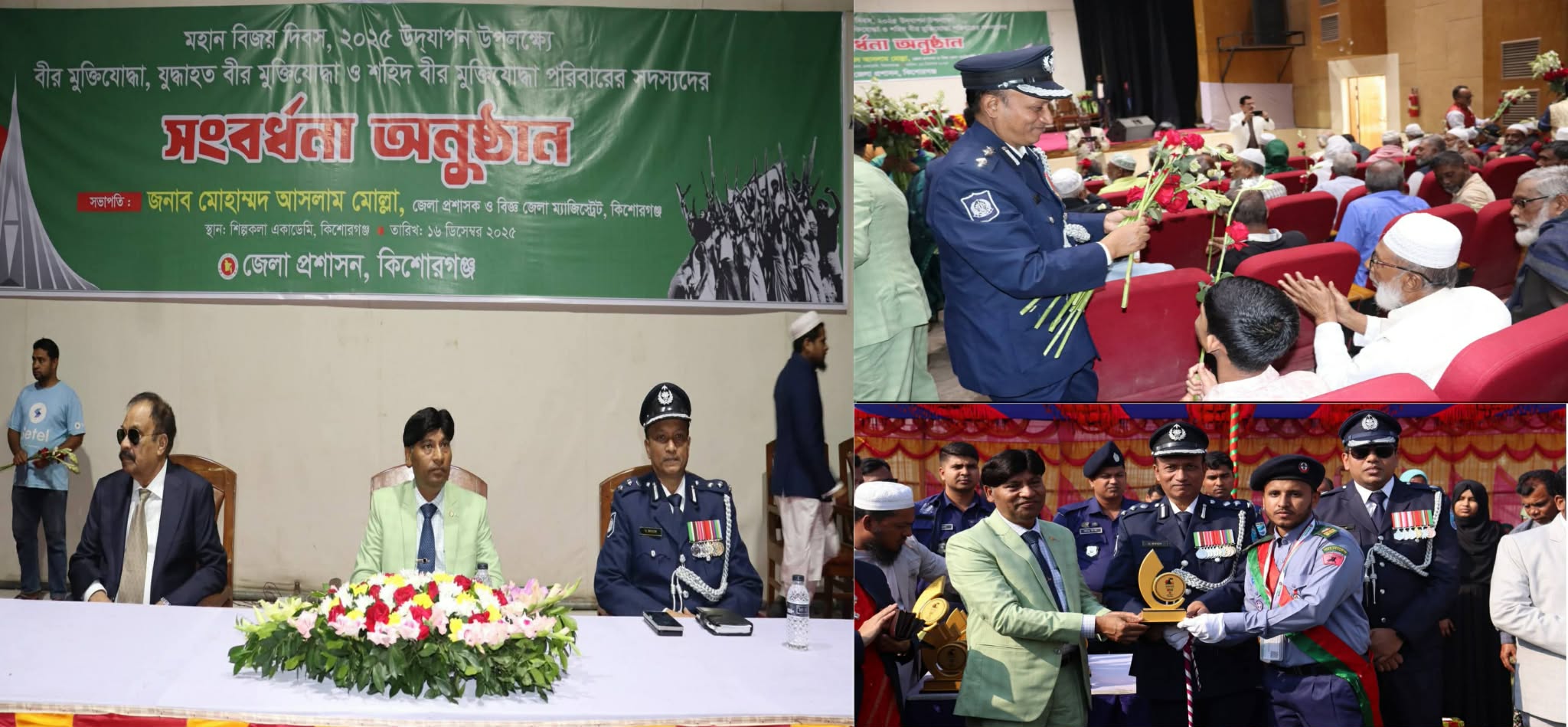 মহান বিজয় দিবস-২০২৫ উপলক্ষে কিশোরগঞ্জে নানা কর্মসূচির মধ্য দিয়ে দিবসটি উদযাপন করা হয়েছে। মঙ্গলবার (১৬ ডিসেম্বর) সকাল ৯টা থেকে জেলা প্রশাসনের আয়োজনে কিশোরগঞ্জ জেলা ক্রিকেট স্টেডিয়ামে বিভিন্ন বাহিনী ও স্কুল-কলেজের শিক্ষার্থীদের অংশগ্রহণে সম্মিলিত কুচকাওয়াজ, শারীরিক কসরত প্রদর্শন, পুরস্কার বিতরণী অনুষ্ঠান এবং বিজয় মেলা অনুষ্ঠিত হয়।