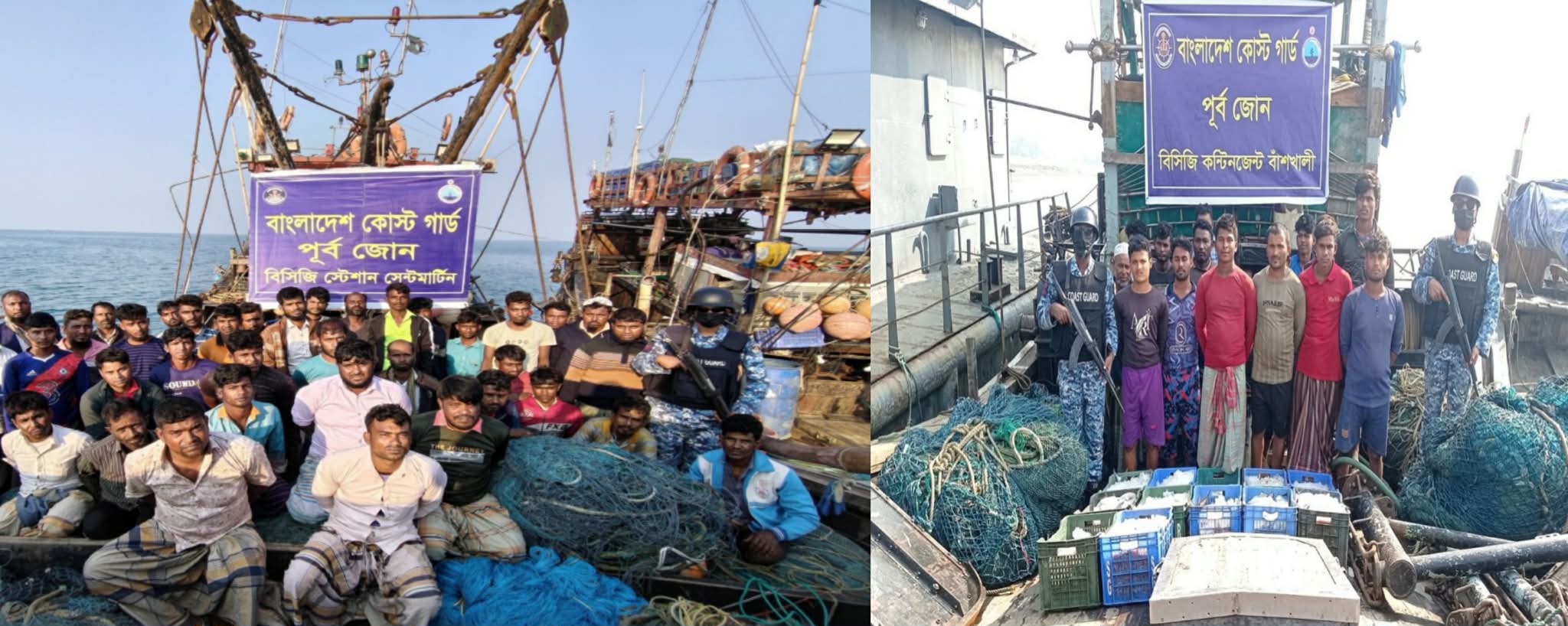 কোস্ট গার্ডের পৃথক দুটি অভিযানে ৩টি অবৈধ আর্টিসানাল ট্রলিং বোট, ৩০টি ট্রলিং জাল এবং বিপুল পরিমাণ সামুদ্রিক মাছসহ ৫৩ জন জেলেকে আটক করা হয়েছে।