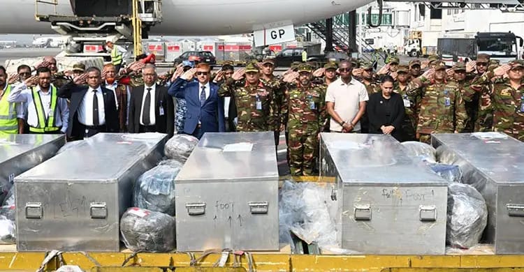 আইএসপিআর জানায়, আজ ছয় বাংলাদেশি শান্তিরক্ষীর মরদেহ দেশে আনা হয়েছে। বেলা ১১টা ৫ মিনিটে এমিরেটস এয়ারলাইন্সের মরদেহবাহী ফ্লাইটটি হযরত শাহজালাল আন্তর্জাতিক বিমানবন্দরে অবতরণ করে।