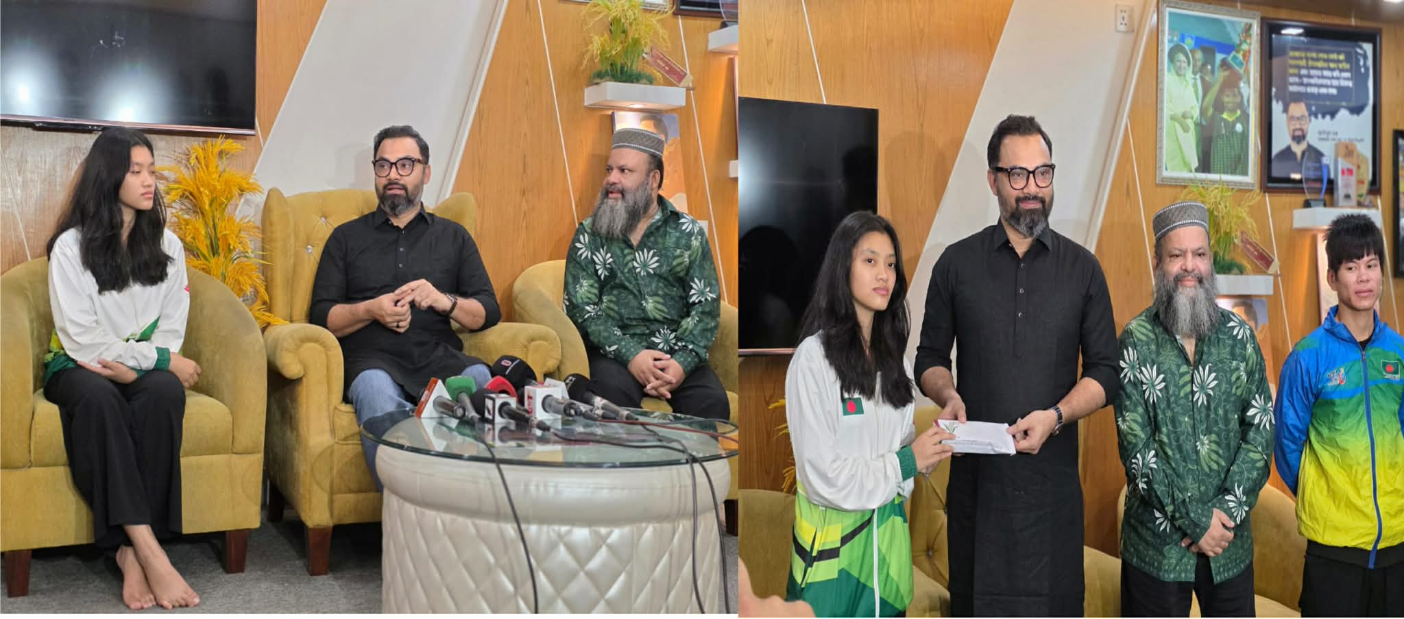 আজ শনিবার (২০ ডিসেম্বর) সকালে রাজধানীর পল্লবীর ইস্টার্ন হাউজিং এলাকায় সৌদি আরবের রিয়াদে অনুষ্ঠিত ইসলামিক সলিডারিটি গেমসে বাংলাদেশের হয়ে রৌপ্য পদক জয়ী খই খই সাই মারমার হাতে আর্থিক অনুদান তুলে দেওয়ার সময় এসব কথা বলেন তিনি। বিএনপির ভারপ্রাপ্ত চেয়ারম্যান তারেক রহমান তার পাশে রয়েছেন।