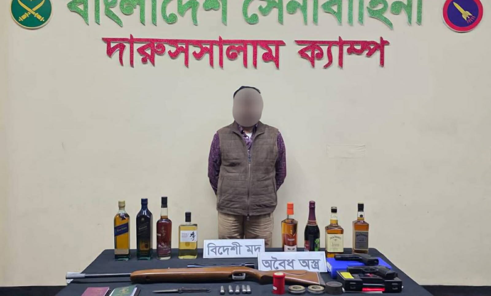 রাজধানীর কল্যাণপুর এলাকায় যৌথ অভিযানে বিদেশি পিস্তল, রাইফেল ও বিদেশি মদসহ মো. নাসির উদ্দিন (৬৫) নামের এক ব্যক্তিকে আটক করেছে সেনাবাহিনী।