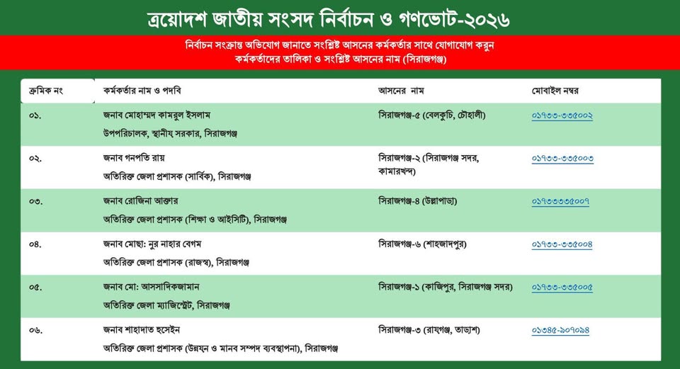 ত্রয়োদশ জাতীয় সংসদ নির্বাচন ও গণ ভোট আয়োজনে সিরাজগঞ্জ জেলার ৬টি সংসদীয় আসনে নির্বাচন সংক্রান্ত যে কোন ধরনের অভিযোগ গ্রহনের জন্য আসন ভিত্তিক জেলা প্রশাসনের ৬জন শীর্ষ কর্মকর্তাকে দায়িত্ব দিয়েছেন জেলা প্রশাসক। দায়িত্বপ্রাপ্ত এসব কর্মকর্তারা কোন অভিযোগ প্রাপ্তির পর প্রয়োজনীয় উদ্যোগ গ্রহন করবেন। জেলা প্রশাসনের ফেসবুক পেজে দায়িত্বপ্রাপ্ত এসব কর্মকর্তাদের নাম ও মোবাইল নম্বরসহ তালিকা প্রকাশ করে সকলকে প্রয়োজনে তাদের সাথে যোগাযোগ করতে বলা হয়েছে।