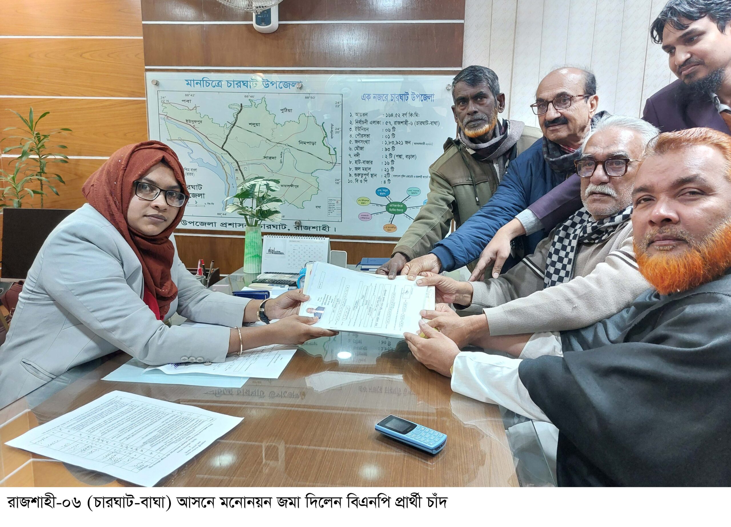 সোমবার দুপুরে চারঘাট উপজেলা নির্বাহী কর্মকর্তা ও সহকারী রিটার্নিং কর্মকর্তা জান্নাতুল ফেরদৌস এর কার্যালয়ে নিজে উপস্থিত থেকে এই মনোনয়নপত্র দাখিল করেন চাঁদ।