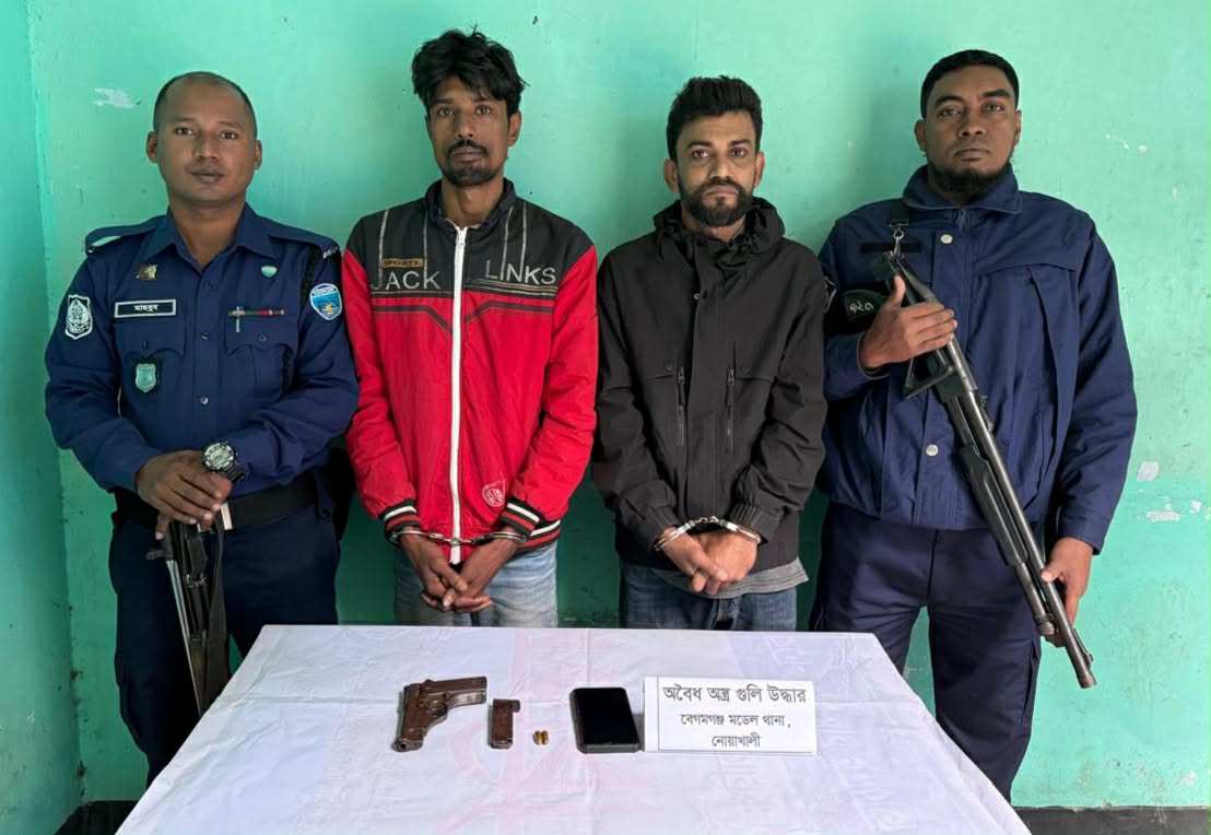 নোয়াখালীর বেগমগঞ্জের চৌমুহনী বাজারের একটি আবাসিক হোটেল থেকে বিদেশি পিস্তল ও গুলিসহ দুইজনকে গ্রেফতার করেছে পুলিশ।