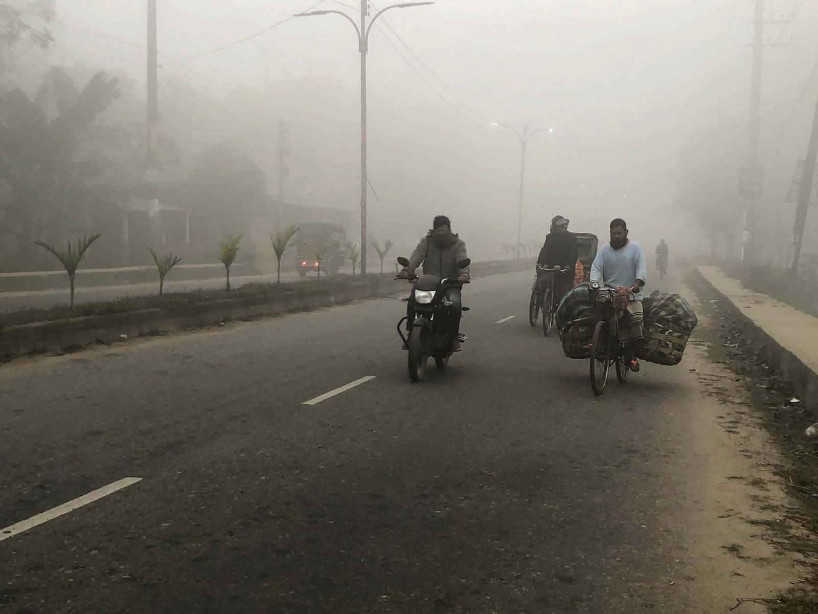 ঘন কুয়াশায় হেড লাইট জ্বালিয়ে জানবহন চলাচল করছে সড়ক- মহাসড়কে।