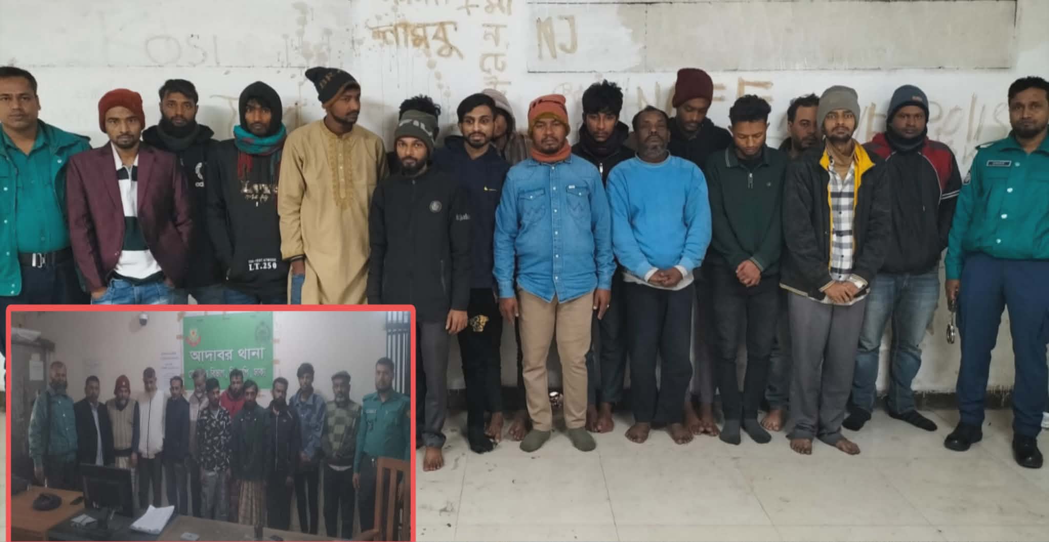 আদাবর থানা এলাকায় গ্রেফতাররাকৃতরা হলো,মো. জাহিদুল হাসান (২০), মো. রাসেল ইসলাম (২৬), মো. মাহাবুব রহমান (৫০), মো. আবু মুছা (৫১), মো. শাহিন (৫০), মো. কবির হোসেন (৫২), মো. হামিদ হাওলাদার (৬০), মো. ওয়াজ উদ্দিন (৫৮), মো. রাজা মিয়া (৩০), মো. শাহাবুল ইসলাম (৪৩) ও মো. শামীম ইসলাম (৩০)।