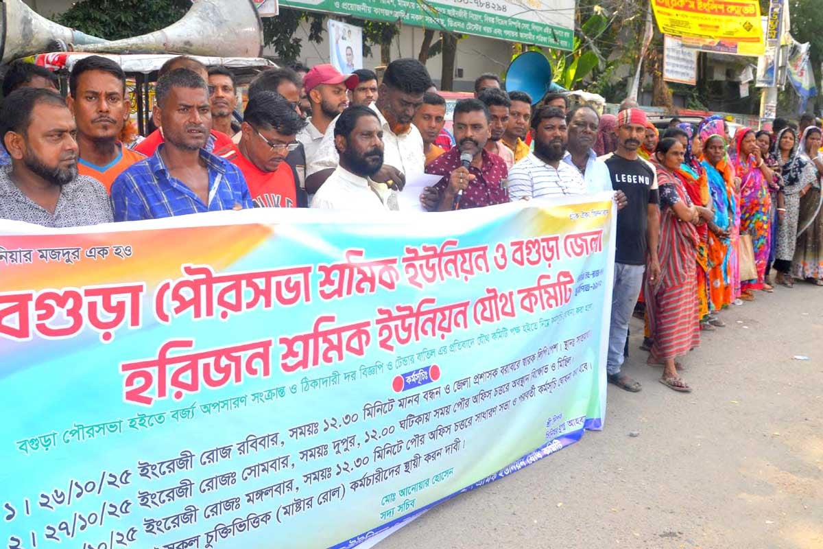 বগুড়া পৌরসভা থেকে বর্জ্য অপসারণ সংক্রান্ত ও ঠিকাদারী দর বিজ্ঞপ্তি এবং টেন্ডার বাতিলের দাবিতে মানববন্ধন অনুষ্ঠিত হয়েছে। রবিবার (২৬ অক্টোবর) দুপুর ১২টায় শহরের সাতামাথায় বগুড়া পৌরসভা শ্রমিক ইউনিয়ন ও জেলা হরিজন শ্রমিক ইউনিয়ন যৌথ কমিটির উদ্যোগে এই মানববন্ধন অনুষ্ঠিত হয়।