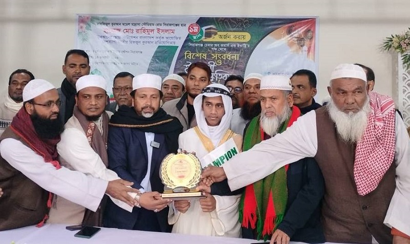 জাতীয় হিফজুল কুরআন প্রতিযোগিতায় প্রথম স্থান অধিকারী সিরাজগঞ্জের এতিম হাফেজ রাহিমুলকে সংবর্ধনা দেয়া হয়েছে। বৃহস্পতিবার বিকেলে সিরাজগঞ্জ চেম্বার অব কমার্স এন্ড ইন্ডাষ্ট্রির পক্ষ থেকে শহরের বাজার স্টেশন মুক্তমঞ্চে এ সংবর্ধনা প্রদান করা হয়। হাফেজ রাহিমুল ইসলাম কুরআনের ছোয়া ফাউন্ডেশন বাংলাদেশ আয়োজিত দেশব্যাপী জাতীয় হিফজুল কুরআন প্রতিযোগিতায় সারাদেশের সাড়ে তিন হাজার প্রতিযোগীর মধ্যে প্রথম স্থান অর্জন করেন। সে শহরের সয়াধানগড়া গ্রামের বাসিন্দা। তার বাবা-মা দুজনেই মৃত।