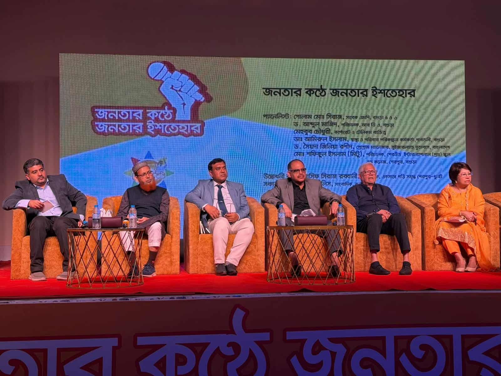 উদ্বোধনী ও বিশেষ অতিথিদের বক্তব্য আমিনুল মজলিসের সঞ্চালনায় অনুষ্ঠানের উদ্বোধনী বক্তা ছিলেন ‘একসাথে গড়ি সমৃদ্ধ শেরপুর-ধুনট’-এর আহ্বায়ক আসিফ সিরাজ রব্বানী। বিশেষ অতিথি হিসেবে উপস্থিত ছিলেন আরডিএ বগুড়ার পরিচালক ড. আব্দুল মজিদ, বিশিষ্ট করপোরেট ব্যক্তিত্ব মেহবুব চৌধুরী, ডা. আমিরুল ইসলাম, সুইজারল্যান্ড দূতাবাসের প্রোগ্রাম ম্যানেজার ড. সৈয়দা জিনিয়া রশীদ এবং শেরউড ইন্টারন্যাশনাল স্কুল এন্ড কলেজের পরিচালক মো. শফিকুল ইসলাম (মিঠু)। তৃণমূলের কণ্ঠে সমস্যার বাস্তব চিত্র আলোচনা সভায় ‘জনতার কণ্ঠে’ উঠে আসে স্থানীয় মানুষের নানা দীর্ঘদিনের বঞ্চনার কথা।