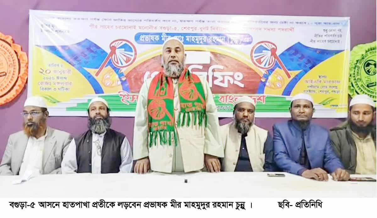 বগুড়া-৫ (শেরপুর-ধুনট) আসনে ইসলামী আন্দোলন বাংলাদেশ মনোনীত প্রার্থী হিসেবে হাতপাখা প্রতীক নিয়ে নির্বাচনের ঘোষণা দিয়েছেন প্রভাষক মীর মাহমুদুর রহমান চুন্নু। গতকাল মঙ্গলবার শেরপুর বাসষ্ট্যান্ডে নিজ কার্যালয়ে এক প্রেস ব্রিফিংয়ের মাধ্যমে তিনি তাঁর নির্বাচনী কর্মপরিকল্পনা ও দলের সিদ্ধান্তের কথা তুলে ধরেন।