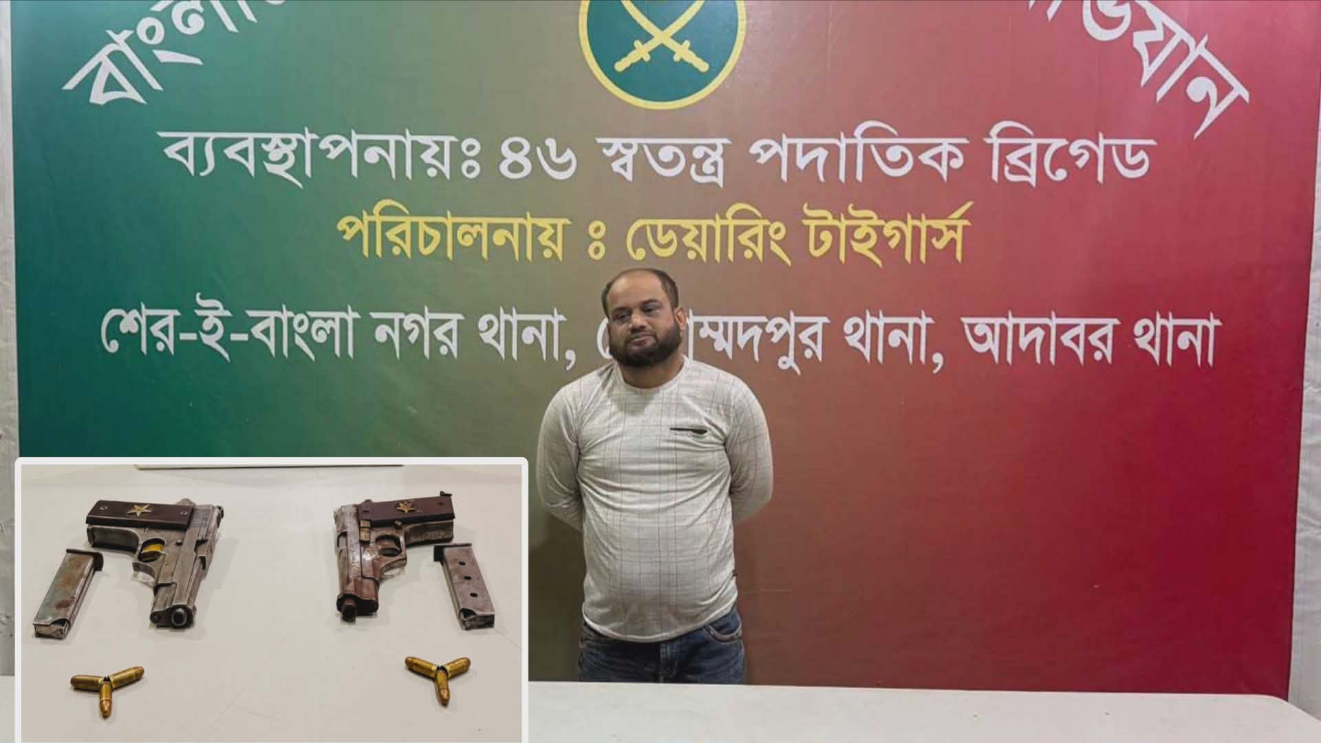 রাজধানীর মোহাম্মদপুরের কৃষি মার্কেট এলাকায় সেনাবাহিনীর বিশেষ অভিযানে দুটি বিদেশি পিস্তল ও গুলিসহ জাহিরুল ইসলাম (৪৪) নামে এক অস্ত্রধারী সন্ত্রাসী ও চাঁদাবাজকে আটক করা হয়েছে।