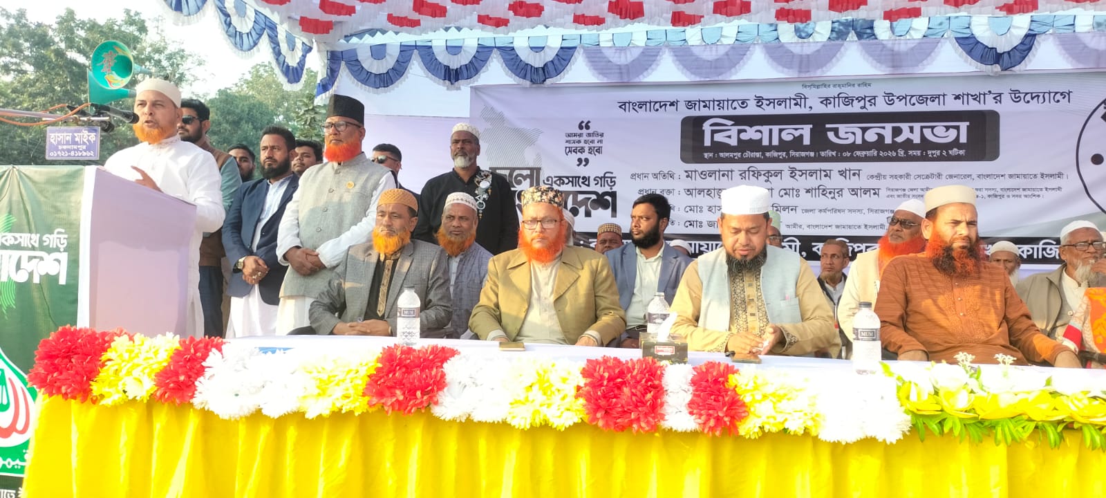 বাংলাদেশ জামায়াতে ইসলামী কাজিপুর উপজেলা শাখার উদ্যোগে রবিবার (৮ ফেব্র“য়ারি) বিকেলে উপজেলার আলমপুর চৌরাস্তা মার্কেট সংলগ্ন মাঠে এ জনসভা অনুষ্ঠিত হয়। কাজিপুর উপজেলা জামায়াতের আমীর মাওলানা মোঃ জাহিদুল ইসলাম স্বপনের সভাপতিত্বে উক্ত জনসভায় প্রধান অতিথি হিসেবে বক্তব্য রাখেন জামায়াতের কেন্দ্রীয় সহকারী সেক্রেটারি জেনারেল মাওলানা মোঃ রফিকুল ইসলাম খান। প্রধান বক্তা হিসেবে বক্তব্য রাখেন