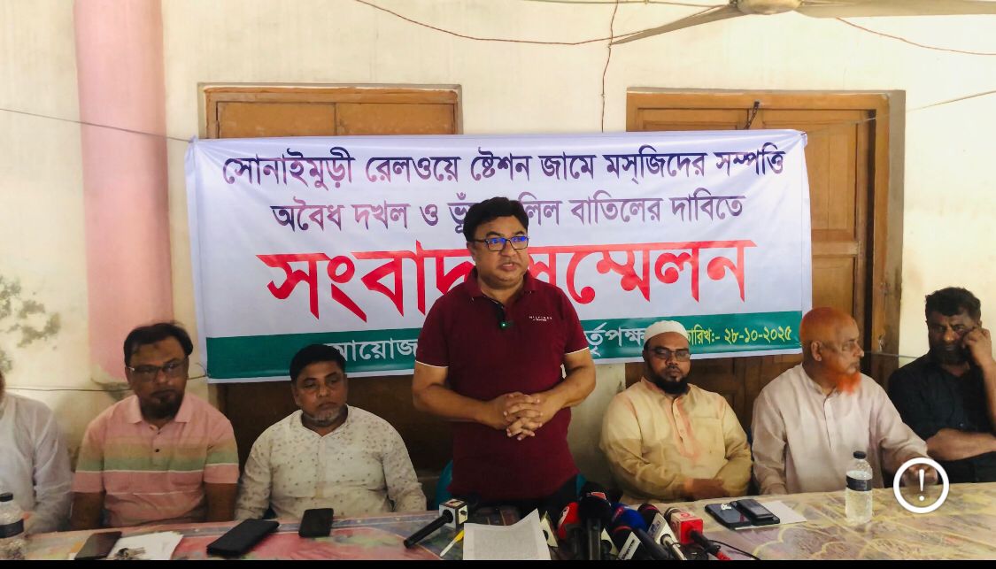 নোয়াখালীর সোনাইমুড়িতে রেলওয়ে স্টেশন জামে মসজিদের দখলকৃত সম্পত্তি পুনরুদ্ধার ও ভুয়া দলিল বাতিলের দাবিতে সংবাদ সম্মেলন করেছে মসজিদ পরিচালনা কমিটি ও স্থানীয় মুসল্লিরা।
