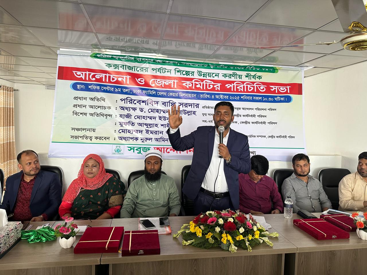 কক্সবাজার জেলার পর্যটন শিল্পের উন্নয়নে করণীয় শীর্ষক আলোচনা ও সবুজ আন্দোলনের জেলা কমিটির পরিচিতি সভা অনুষ্ঠিত হয়েছে। শনিবার সকালে (৪ অক্টোবর ২০২৫) কক্সবাজার জেলা শহরের শফিক সেন্টারে ঢাকা ফ্যামিলি হেলথ্ কেয়ার মিলনায়তনে কক্সবাজার জেলার সাধারণ সম্পাদক মো. ইমরান খানের সঞ্চালনা ও জেলার সভাপতি অধ্যাপক নুরুল আমিন সিকদার ভুট্টোর সভাপতিত্বে প্রধান অতিথি হিসেবে উপস্থিত ছিলেন সবুজ আন্দোলনের প্রতিষ্ঠাতা ও পরিচালনা পরিষদের চেয়ারম্যান পরিবেশবিদ বাপ্পি সরদার। প্রধান আলোচক হিসেবে উপস্থিত ছিলেন কক্সবাজার চেম্বারের সভাপতি ও সবুজ আন্দোলন কেন্দ্রীয় কার্যনির্বাহী পরিষদের যুগ্ম সাধারণ সম্পাদক অধ্যক্ষ ড. মোহাম্মদ সানাউল্লাহ। বিশেষ অতিথি ছিলেন কেন্দ্রীয় কার্যনির্বাহী পরিষদের সহ-ধর্ম বিষয়ক সম্পাদক হাজী মোহাম্মদ ইউনুস, ইসলামী চিন্তাবিদ মুফতি আব্দুল্লাহ শাহীন।
