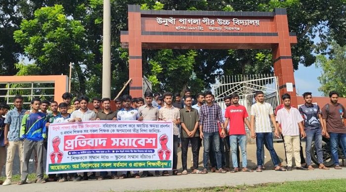 সিরাজগঞ্জের সলঙ্গা থানার রামকৃষ্ণপুর ইউনিয়নের উনুখাঁ পাগলাপীর উচ্চ বিদ্যালয়ে প্রধান শিক্ষককে লাঞ্ছিত ও শিক্ষকদের অপমানের ঘটনার প্রতিবাদে বিদ্যালয় প্রাঙ্গণে এক প্রতিবাদ সমাবেশ অনুষ্ঠিত হয়েছে। বৃহস্পতিবার (৩০ অক্টোবর) দুপুরে বিদ্যালয়ের বর্তমান